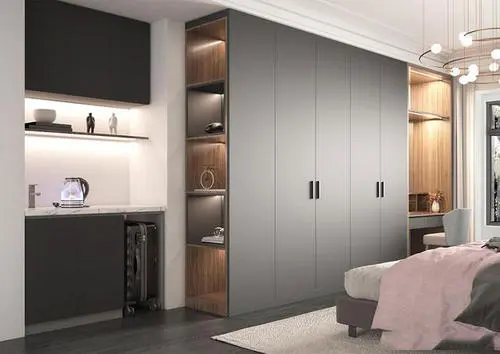 7、看家具配套性、系统性。专业板式家具制造企业,不仅可以制作衣柜、衣帽间、书柜,还提供鞋柜、酒柜、床、梳妆台、床头柜及旋转衣架等系统家居配套产品。经过整体协调设计,不仅可以免去消费者东奔西走、东拼西凑的麻烦,而且面板统一,颜色协调,款式匹配,家具整体性高。